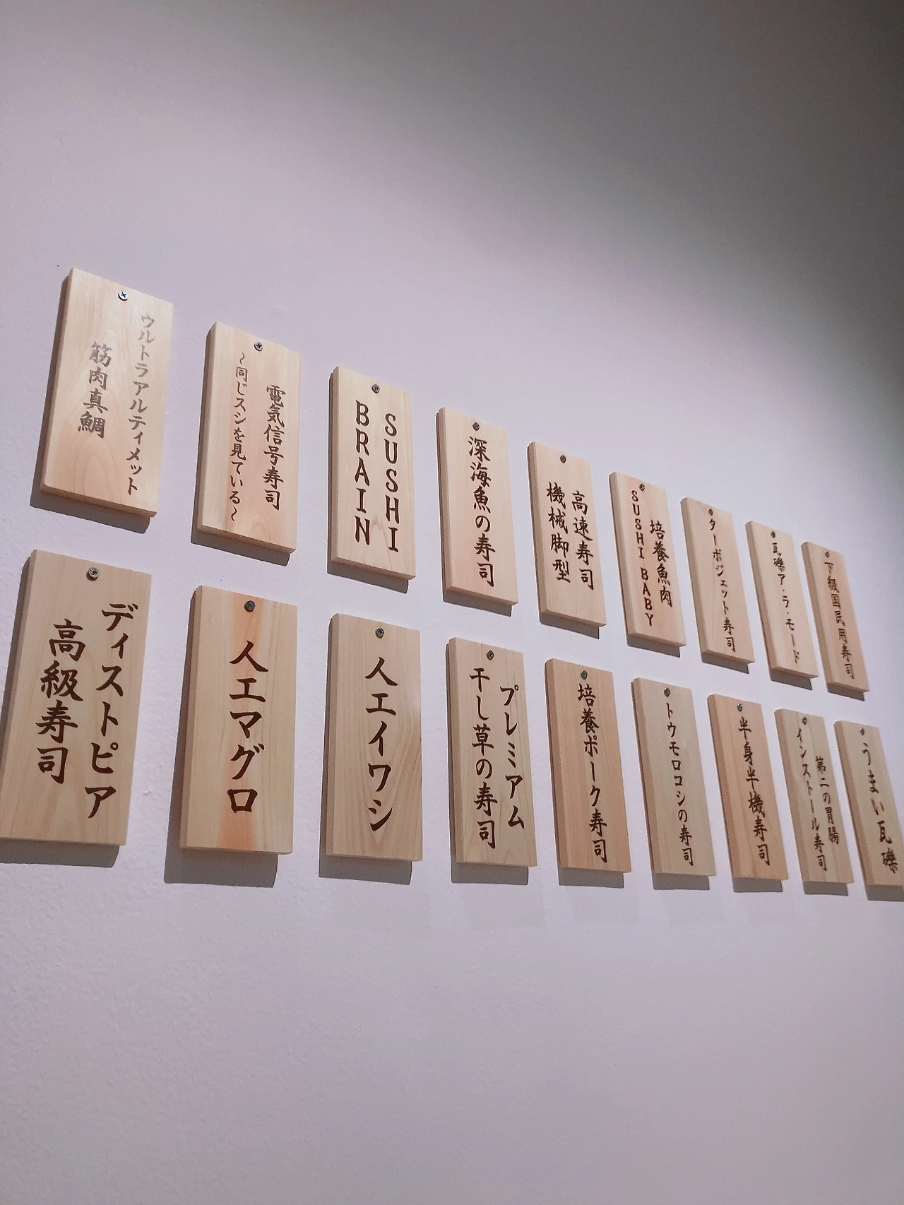 메뉴판 웃기니까 읽어드릴게요. 울트라얼티메이트 근육도미, 전기신호스시, 터보제트스시, 스시브레인, 인공다랑어, 프리미엄 잡초스시, 디스토피아 고급스시, 반신반기(반인반기계)의 스시.... 가격은 한 접시 100엔부터 70만 엔까지.