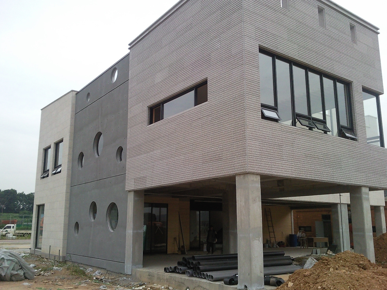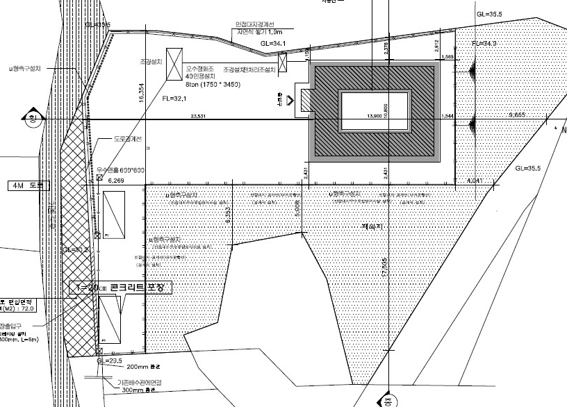 건축물의 배치는 주변의 인접한 낮은 임야를 절토해서 동쪽은 약간 열고 주변을 둘러싸도록 '미음자' 형 건물을 앉히기로 결정했습니다. '미음자' 집의 경우 장단점 있습니다. 내부의 마당을 중정으로 쓰면서 활용도를 높일 수 있다는 것은 장점 중 큰 장점입니다. '미음자' 집에 생기는 중정[中庭] 공간은 외부와 내부를 자연스럽게 연결해 주기도 합니다. 또한 진입도로에서 내부 공간을 쉽게 들여다볼 수 없어 '개방감과 폐쇄감'이 적절한 조화를 이룰 수 있습니다.