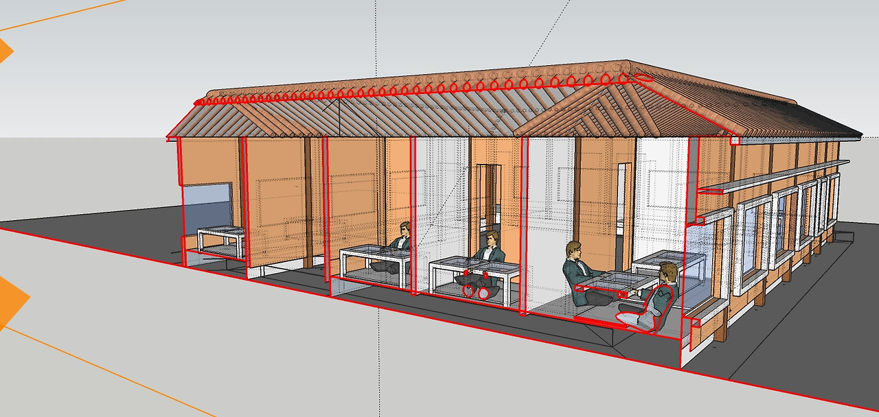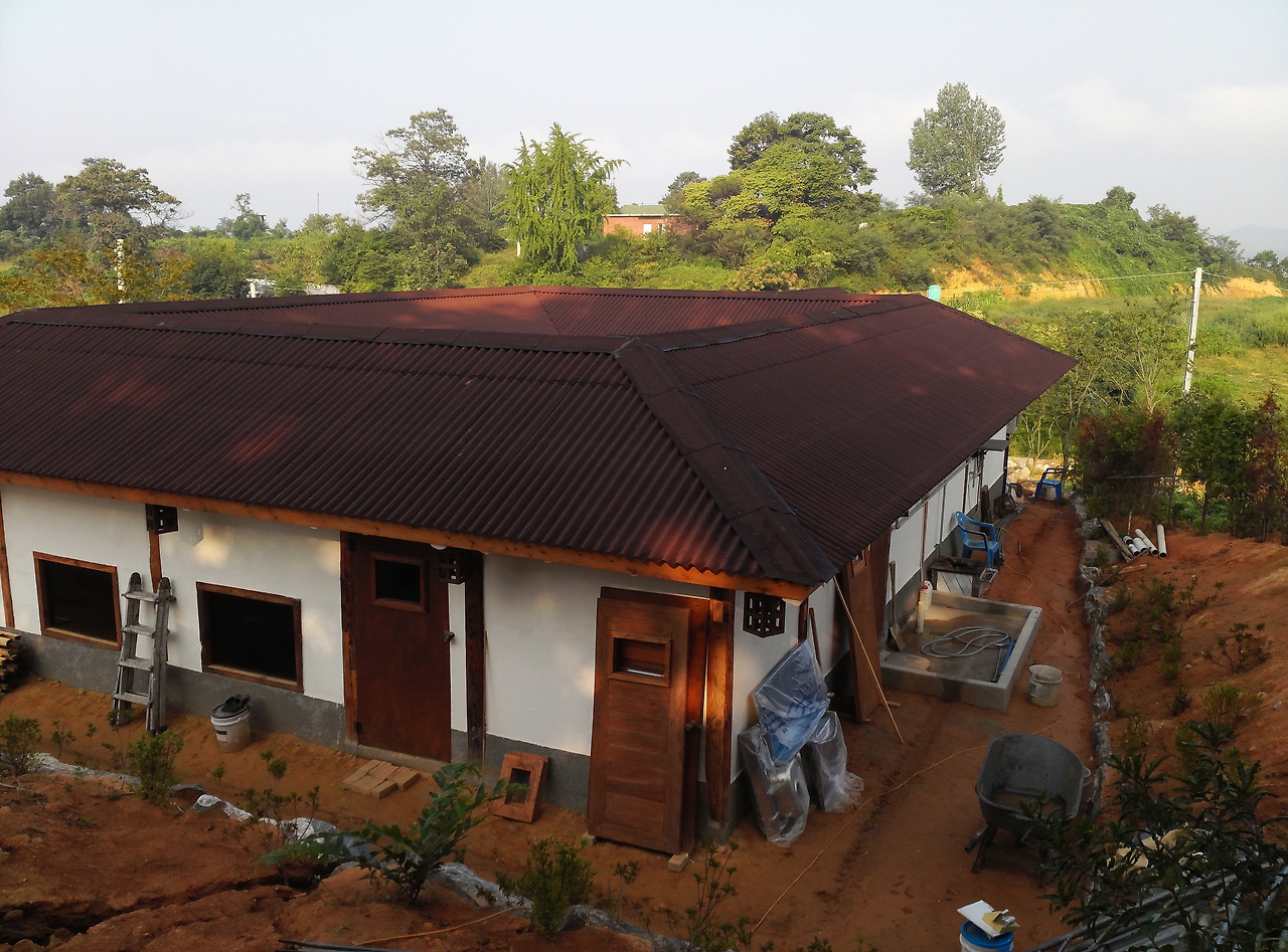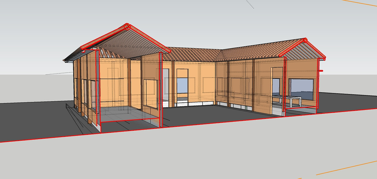 어찌 되었든 건축주가 요구하는 플랜과 기능이 있었고 조건과 관계없는 '미음자' 형태의 배치를 하고 보니 여러 가지 풀어야 할 문제점과 보완해야 할 동선이 생겼습니다. 설계를 옮기는 세부적인 실시설계 단계에서 정리를 하여 검토할 사항이었습니다. 프로젝트를 진행하다 보면 목조주택 설계가 가장 어려움이 많습니다. 새로운 기능성과 변수를 지니고 있고 자연과의 관계까지 고려해서 실제적인 공간을 연출해야 하는 아주 까다로운 설계입니다. 주변 경관요소와 잘 어울리고 사치스럽지 않으면서 궁색해 보이지 않는 디자인을 요구합니다. 빛을 조절하는 깊은 처마와 추위와 더위에 잘 대응하는 자연 흙덩이 벽체는 일상적으로 살고 있는 아파트에서는 흉내 낼 수가 없는 깊은 기능을 가지고 있습니다.