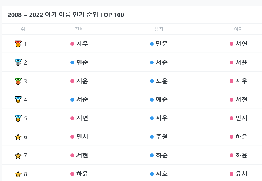 한국인의 이름 인기 순위 [이미지:네임 차트] 전체 1위는 '지우' / [부동산 114]