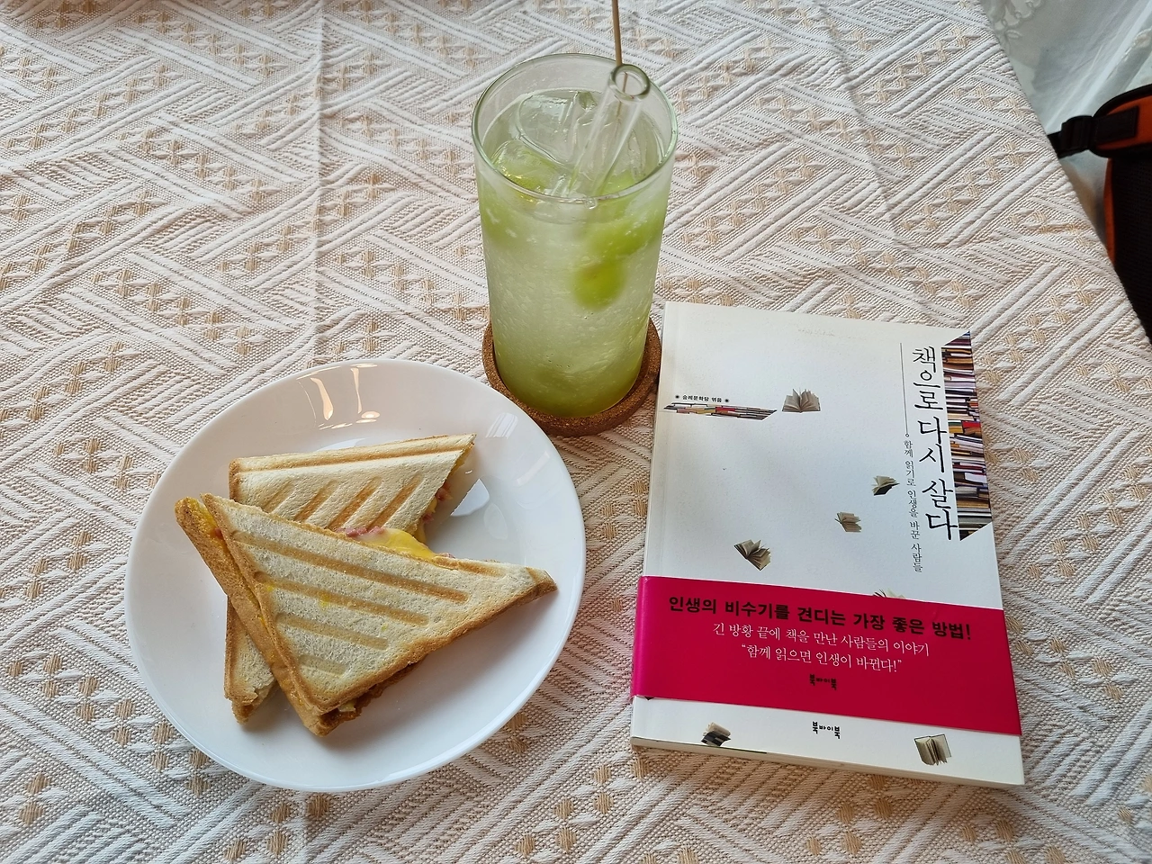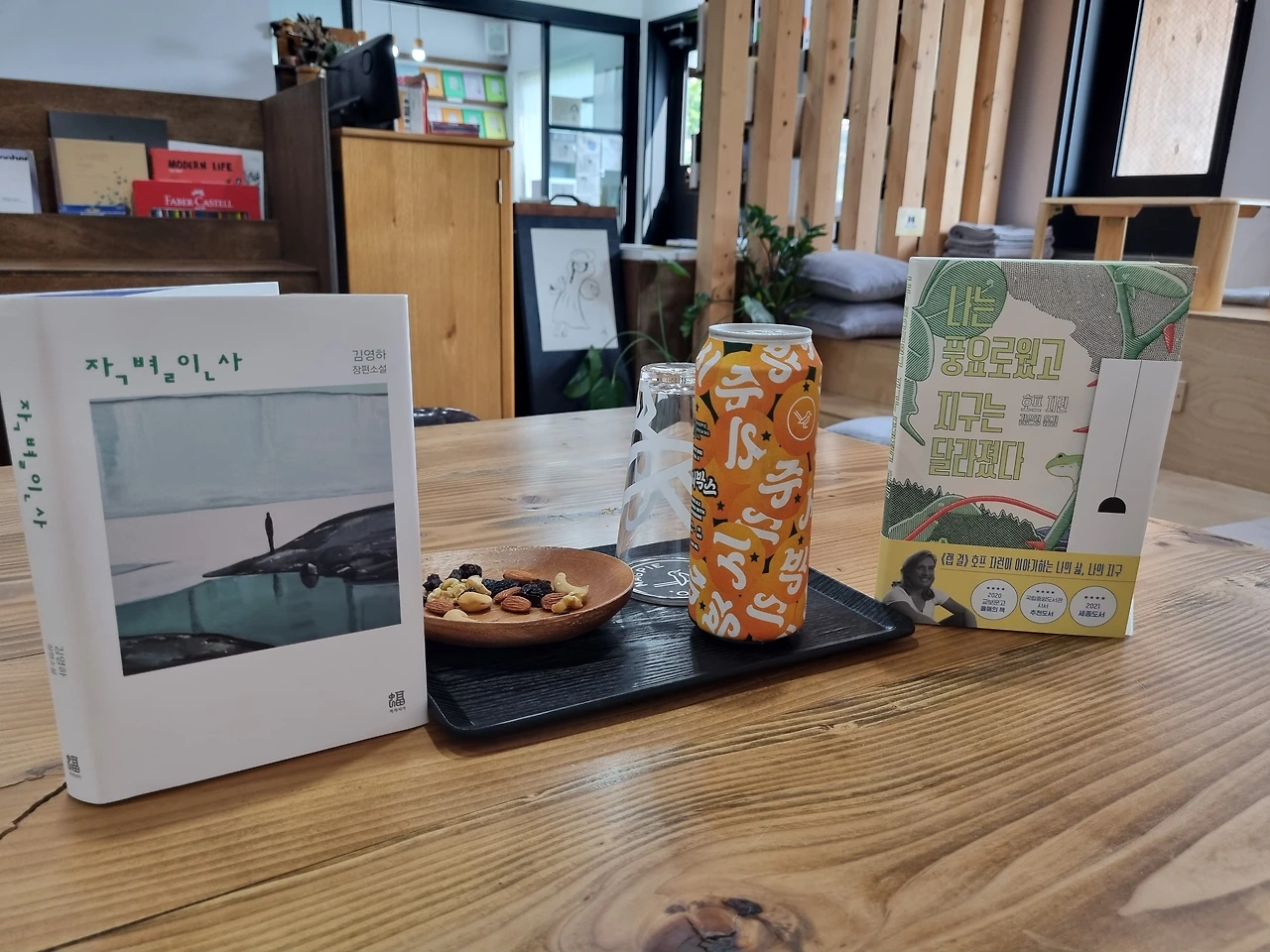 이어 애월로 옮긴 숙소에서는 검색해보니 구좌쪽보다 책방이 적은 것 같았지만새로 생긴 '가포플랫'이라는 곳이 끌렸다. 기타를 치던 젊은 사장님이 운영하는 북카페의 분위기는 어떨지, 어떠한 책들이 있을 지 궁금했다.[책으로 다시 살다] (숭례문학당) 라는 책이 내 손에 잡혔고 맛있는 청포도에이드를 먹으며 흥미롭게 공감하며 읽었다.