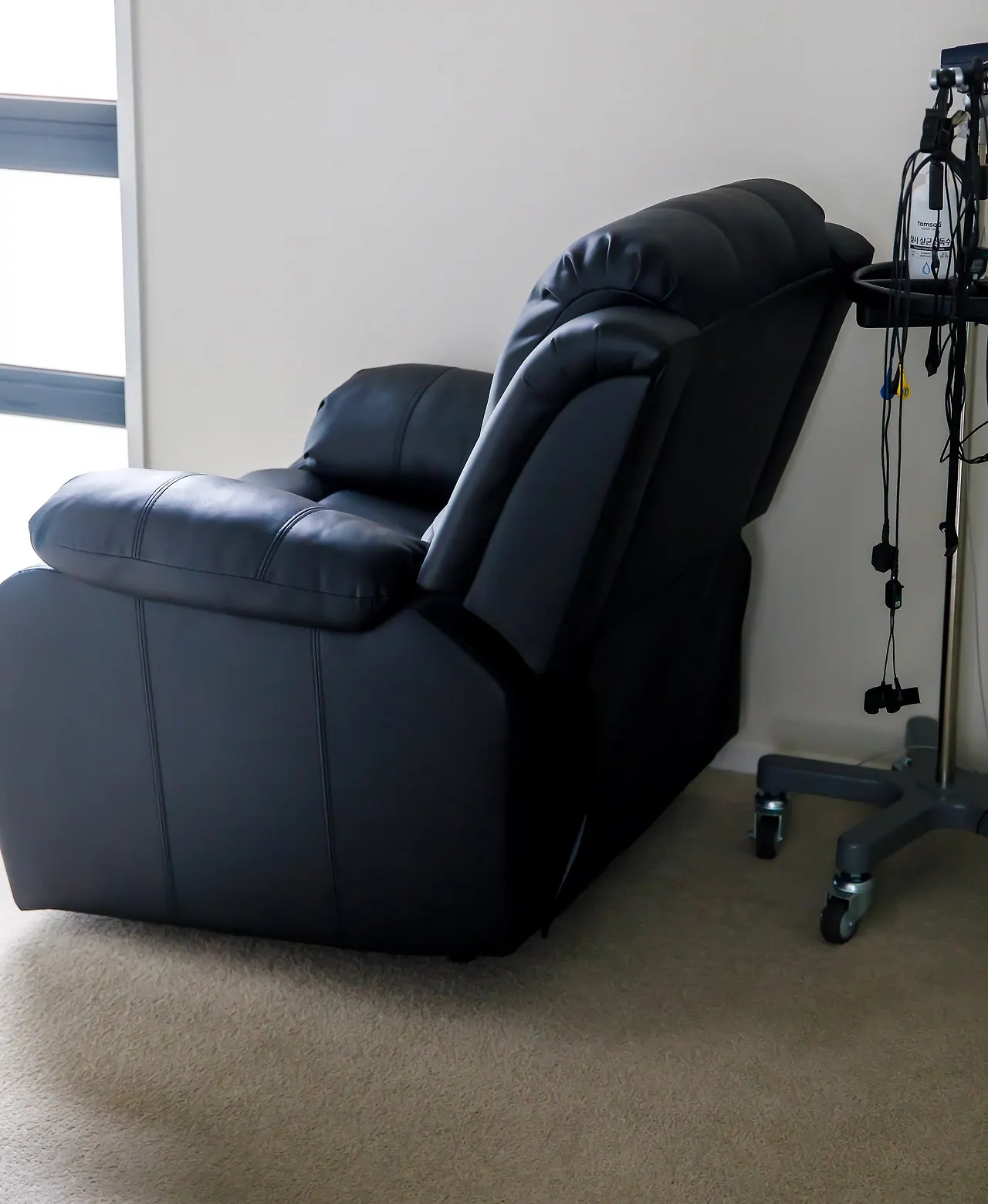 바이오 피드백과 스프라바토 치료에 사용하는 의자입니다. 바이오 피드백은 환자가 직접 자신의 생체 신호를 보며 자율신경계 운동을 촉진하는 요법입니다. 스프라바토는 우울증 완화를 위해 액상 약을 코에 분사하는 치료법이에요. 치료실의 부드럽고 푹신한 리클라이너는 환자가 긴장하지 않도록 도와줍니다. 원활한 치료를 위해 거의 누울 수 있는 각도로 세팅해두었죠.