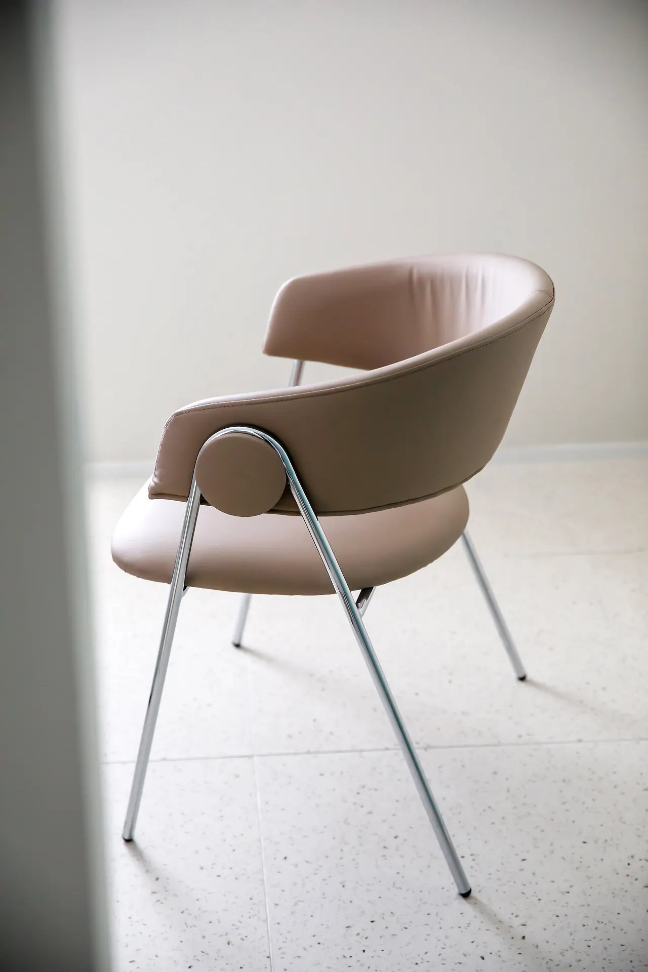 허리까지 올라오는 낮은 등판에 철제 프레임으로 구성된 가죽 의자입니다. 앉았을 때 딱딱하진 않지만 푹신하지도 않은, 중립적인 감촉의 의자이지요. 환자가 심리적으로 위축되지 않도록, 차분한 핑크 베이지 컬러를 골랐습니다.