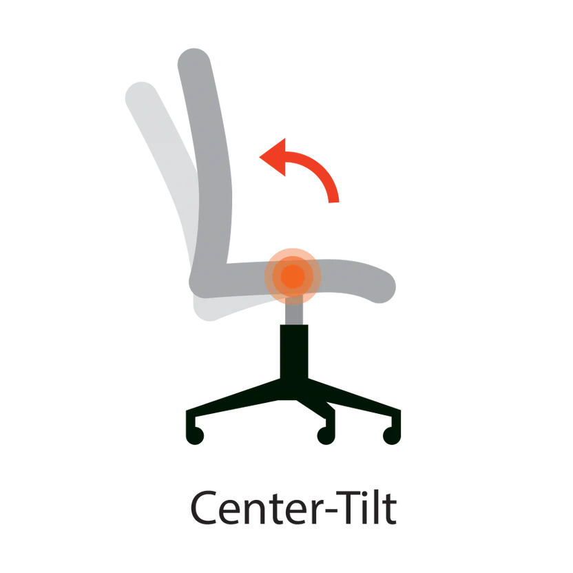 의자의 정중앙, 즉 좌판 한가운데 아래쪽에 회전축이 있어 등받이를 뒤로 젖힐 수는 있지만, 무릎이 들리고 발이 뜨는 자세가 자연스럽게 유도됩니다. 결과적으로 안정감이 떨어지고 오래 기대기는 어렵습니다. 기본형 틸트 중 하나로 기초적 틸팅 시스템을 가진 의자에 여전히 사용됩니다.