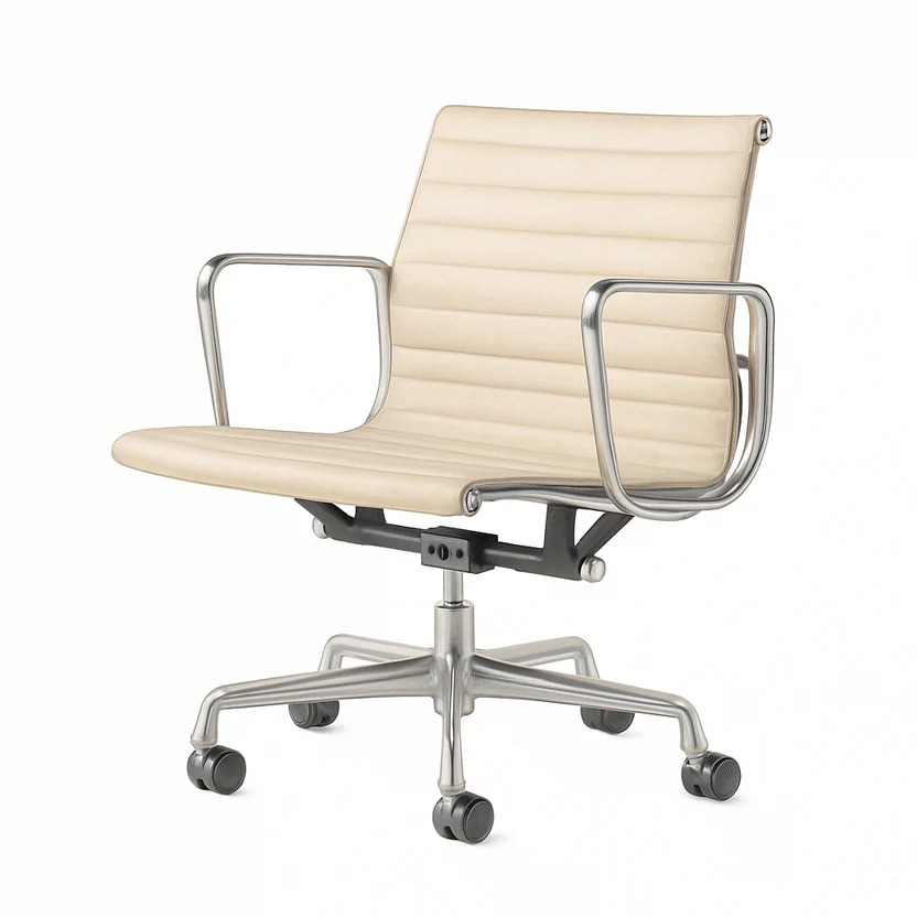 찰스 & 레이 임스 부부가 디자인한 이 의자는 1964년 허먼 밀러의 ‘액션 오피스’에 포함되며 주목받았습니다. 등받이가 뒤로 기울어지긴 했지만, 좌판과 함께 고정된 각도로 움직였기 때문에 몸을 뒤로 젖히면 다리가 들리는 불안정한 구조였지요. 당시 사무 환경은 사용자의 움직임을 유도하려 했지만, 기술적으로는 그 움직임을 충분히 뒷받침하지 못하던 시기였습니다.