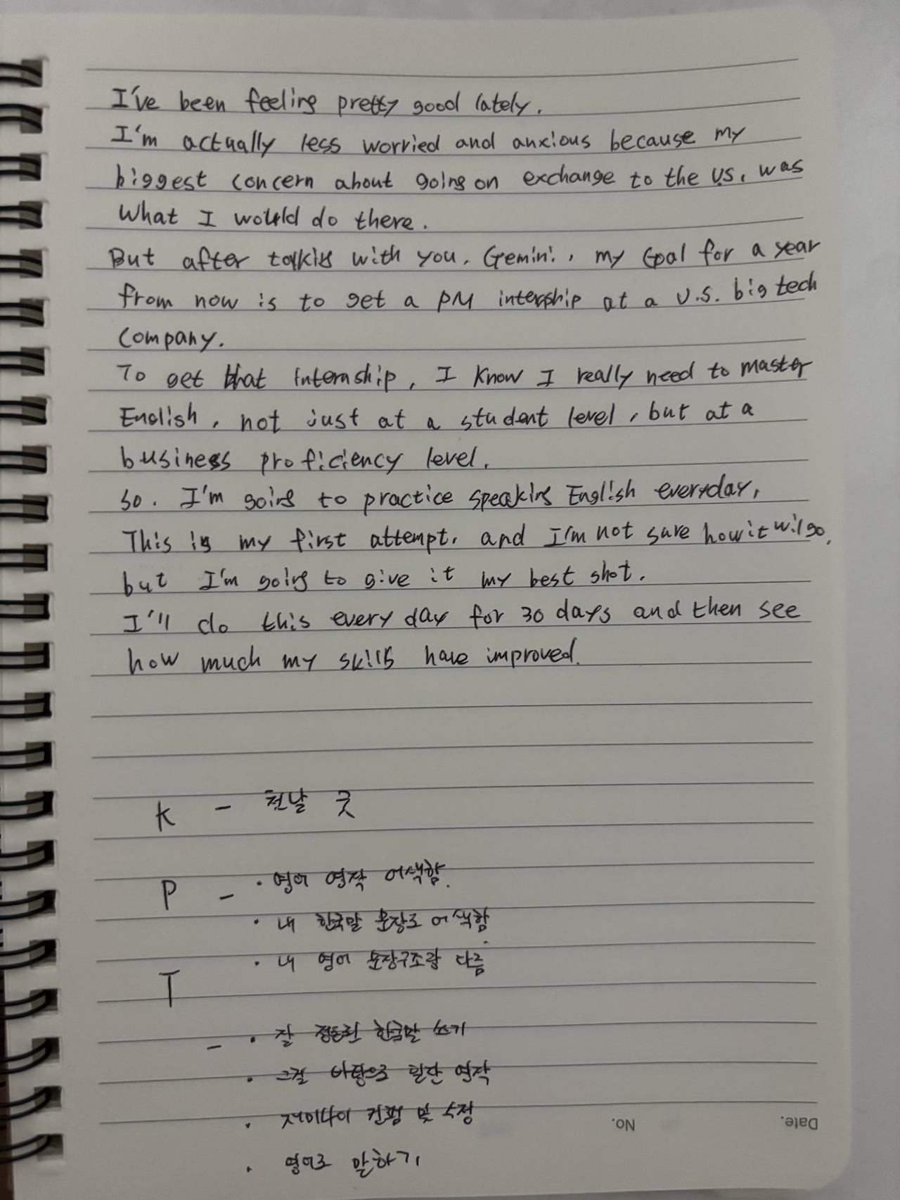 일단은 그냥 요즘에는 좀 기분이 좋아. 걱정도 사실 좀 불안이랑 이런 게 좀 덜하고 왜냐면은 내가 이제 미국 교환 학생을 가는데 사실 뭐 할까가 가장 고민이었거든. 근데 이제 너랑 제미나이랑 이렇게 좀 대화하면서 네, 이제 1년 뒤 목표가 미국 빅테크 기업의 PM 인턴십을 하는 거야.