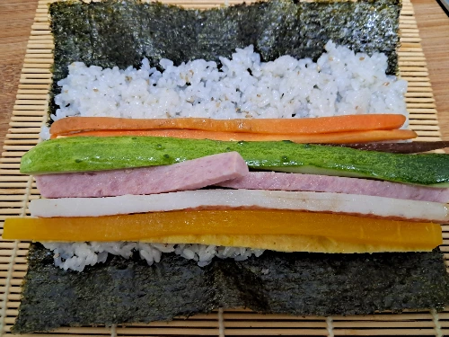 김을 펼쳐놓고 그 위에 밥을 고루 펴고
