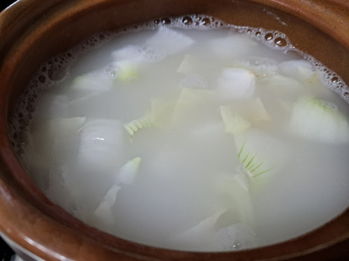 1. 토기에 쌀뜨물 700g을 넣고 다시 멸치 2마리와 디포리 3마리를 넣고 끓였다.