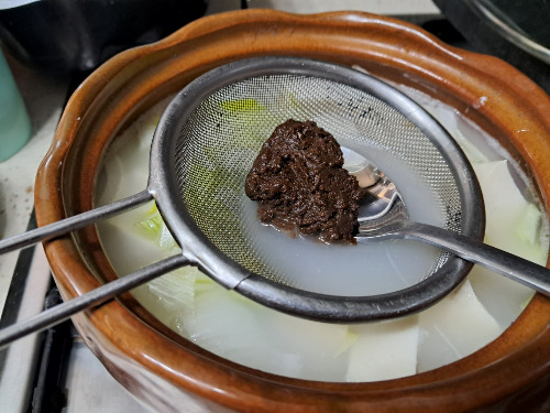 2. 국물이 끓기 시작하자 양파와 감자, 양배추, 두부를 썰어 넣고 된장 1스푼을 으깨 체에 걸러 넣었다.