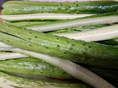 3. 길게 4등분으로 자른 오이를 세로로 5 등분하여 굵은소금을