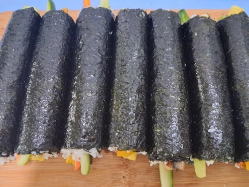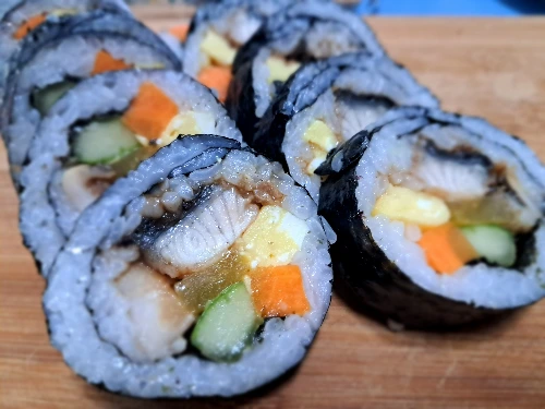 장어에 고추냉이를 바르고 계란지단, 전복, 단무지, 당근, 오이를 넣어 말아준다.