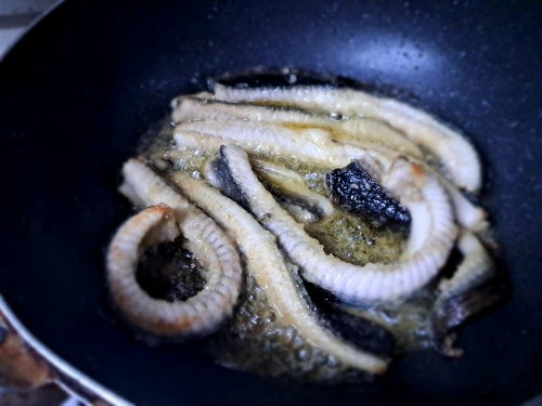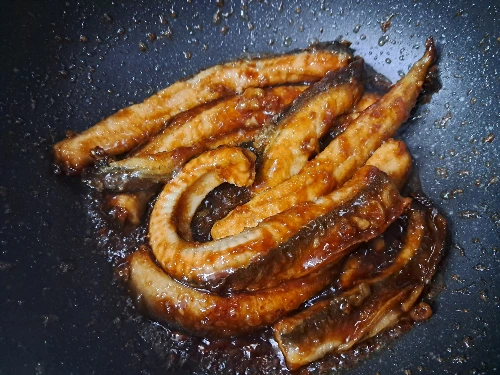 3번의 소스에 2번의 튀김옷을 입혀 튀긴 장어를 넣어 약한 불에