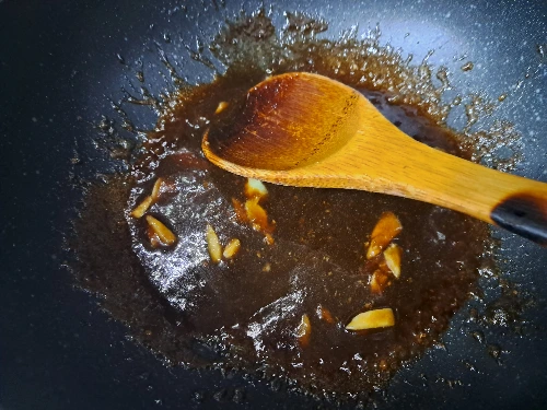 다진 마늘과 생강채, 이온물엿과 꿀, 참기름 넣고 조려준다.