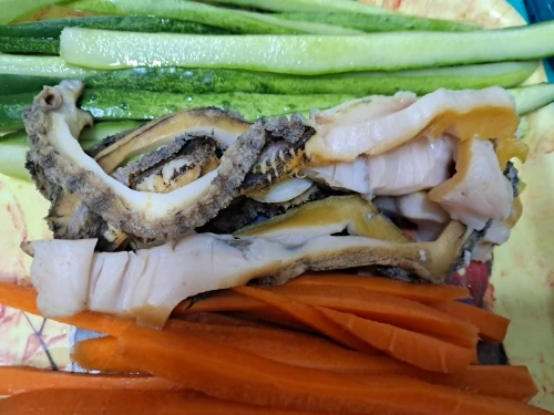 5. 전복은 큰 칫솔로 깨씃이 세척하여 끓는 물에 2분 데친다. 데친 전복을 오리듯