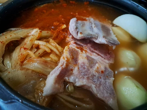 묵은지 또는 포기김치 1쪽, 돼지등뼈 1팩, 감자 4개, 소금 2 티스푼