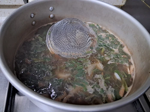 찬물에 여러 번 헹굼 해서 꼭 짜서 끓고 있는 된장물에 넣었다.