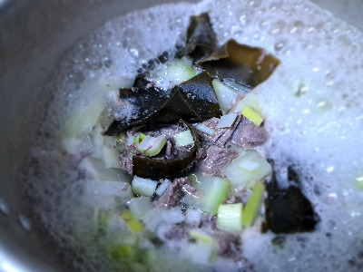 한우 국거리 용 고기와 얄팍하게 썬 무 1/4토막, 굵은소금 한 스푼, 물은 두 컵과 맛술 1스푼, 다시마 6조각, 대파 1대 썬 것과 양파 1/3개 썰어 넣고 중간 불에 자작하게 붓고 7분 끓였더니 물이 반이나 줄었다. 뭇국은 이때 소금과 양파, 대파, 다시마를 넣어야 무와 고기에 간이 배서 맛있다. 어느 정도 무가 살짝 익었다.