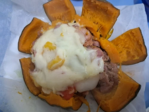 오곡밥을 위에 볶은 야채와 치즈를 올리고 단호박 뚜껑을 덮었다.