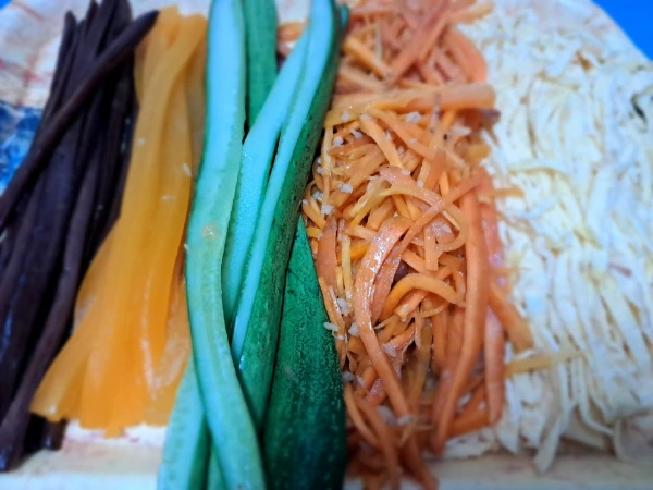 살짝 절인 오이와 계란채, 단무지와 우엉채를 넣고 김밥을 말았다.