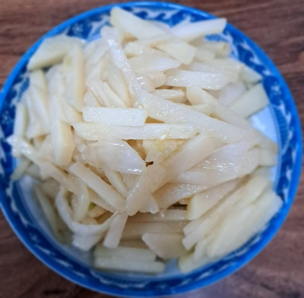 껍질을 벗긴 후 채를 썰어 소금물에 담근다.