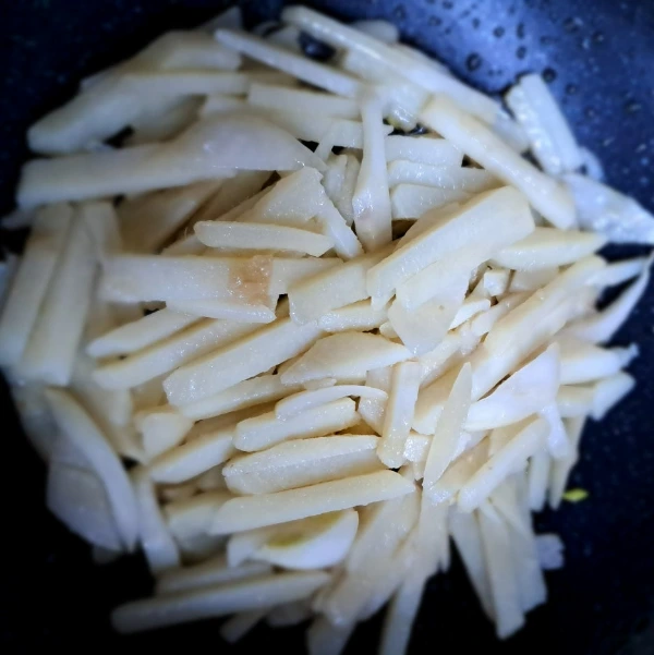 1분 동안 볶아 마늘 기름으로 익힌 감자를 넣고 1분간 볶으면 맛있는 감자볶음이 된다.