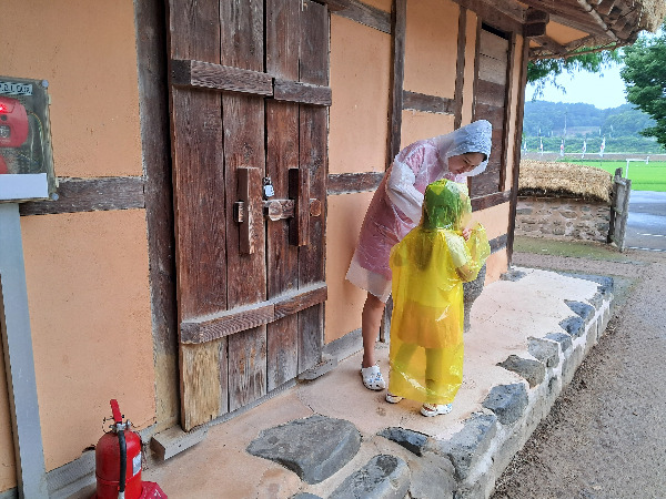 비가 와서 우비를 입고 다녔는데 딸이 손녀에게 설명을 자세히 해주었다.