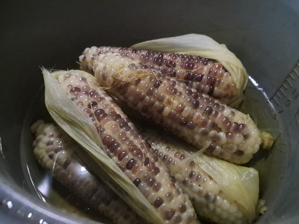 옥수수 수염을 떼어내고 속껍질 한 겹만 남기거나 모두 떼어내고 삶았다.