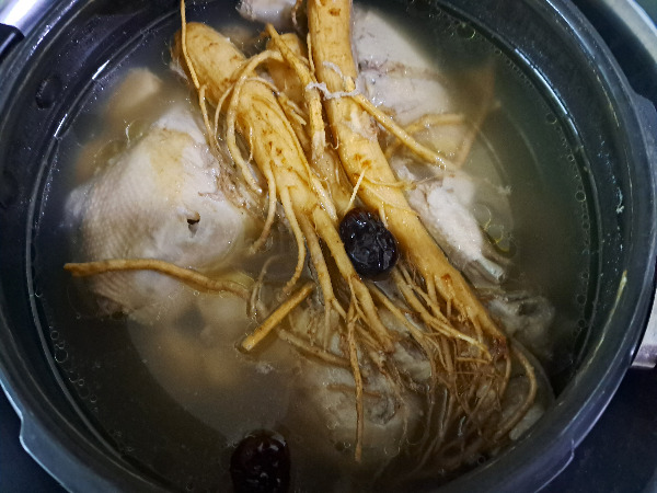 국물은 낸 엄나무와 황기, 삼계탕 재료와 양파는 건져내고 인삼과 대추만 남겼다.