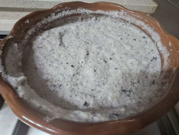 곱게 갈면 식감이 떨어지므로 갈다가 만져보아 거친 느낌이 들면 된다.