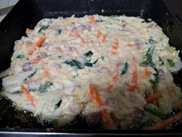 달궈진 팬에 식용유와 올리브유를 넉넉히 두르고 반죽 한 국자를 두툼하게 펼쳤다.