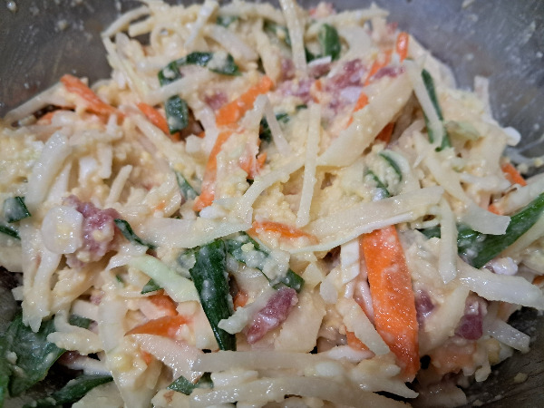 간 녹두에 찹쌀가루와 계란이 들어간 곳에 감자채와 당근채, 양파채, 돼지고기와