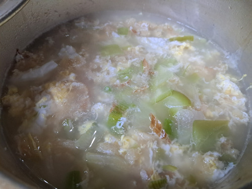 싱거우면 소금을 추가한다. 황태가 충분히 우러나면 풀어놓은 계란물을 위에