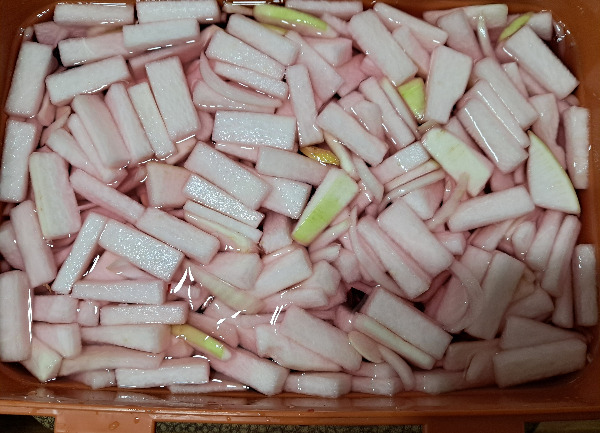1. 무를 세로로 5등분으로 자른다. 손가락 두 마디 크기가 적당하다.