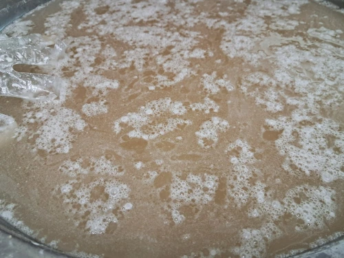6. 찹쌀엿기름 물이 미지근해졌을 때 메주가루 2킬로를 넣어 풀어주고