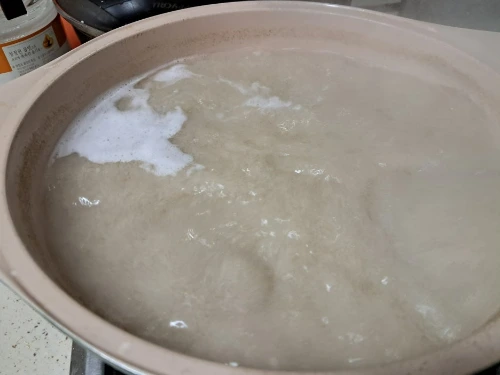4. 3시간 경과하여 숙성된 찹쌀과 엿기름 발효물이 눌지 않게 저으면서 끓여준다.
