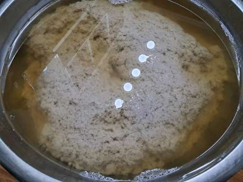 1. 엿기름 2킬로를 미지근한 물 6킬로를 넣고 30분 동안 불려주었다.