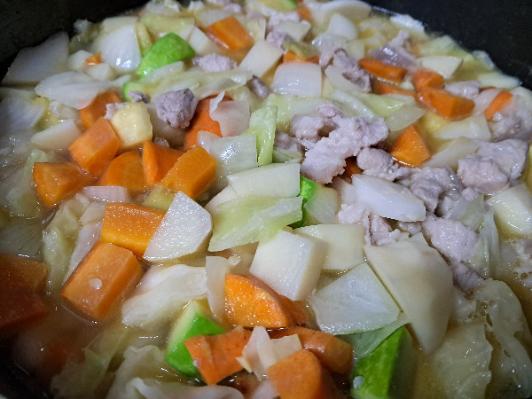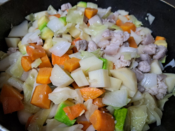 2. 잘 익는 재료인 양배추, 양파, 호박, 생강맛술, 다진 마늘,