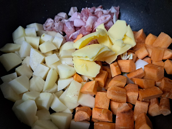 1. 잘 익지 않는 당근과 감자, 돼지고기와 버터 3스푼을 넣고