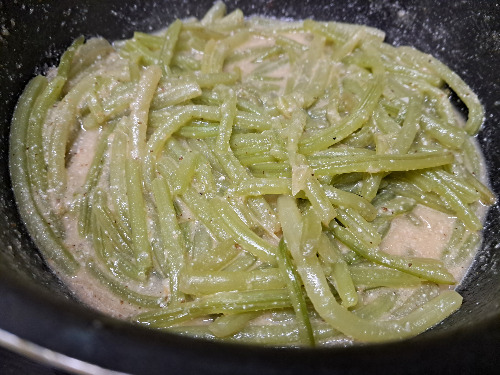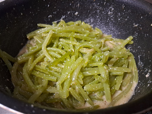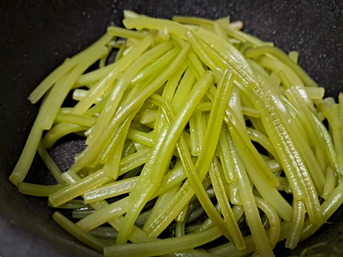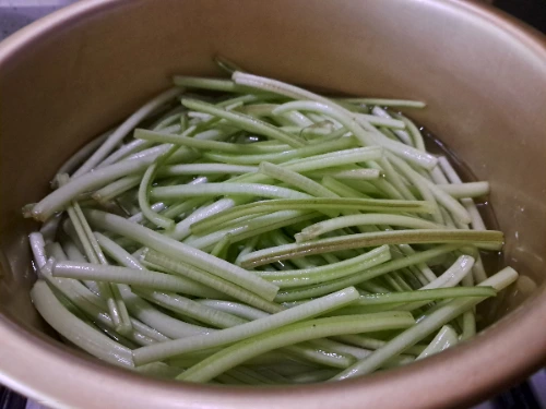 2. 15분 삶아 익은 줄기는 찬물에 헹굼 하여 웍에 넣는다.