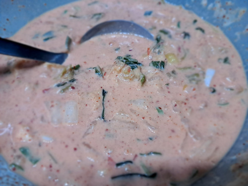 2. 포기김치 잎사귀와 김치 담글 때 떨어진 잎을 잘게 썰어 반죽물에 넣고 섞어주었다.