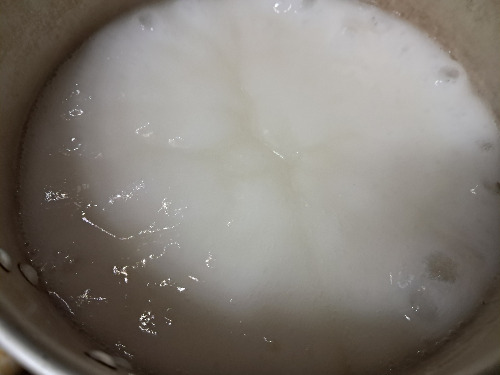 물이 끓으면 밀가루 푼 물을 부어주며 바닥이 눌어붙지 않게 저어준다.