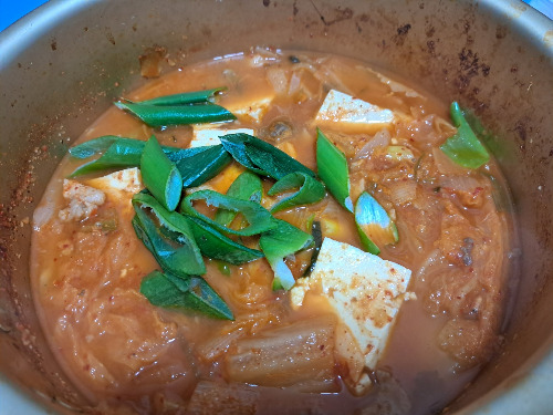 4. 김치찌개가 완성되면 대파 잎 썬 것을 위에 얹는다. 빨간색 바탕에 초록색 대파가 예쁘다.