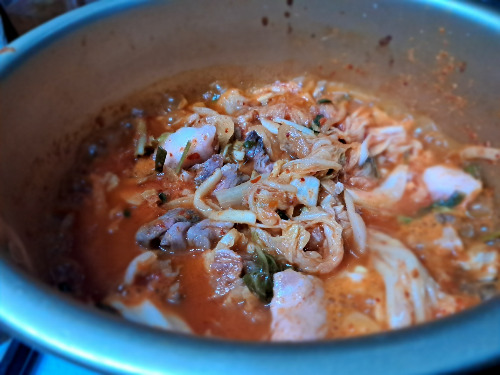 1. 위의 재료대로 배추김치와 양파, 새우젓, 돼지고기와 맛술과 김치국물, 육수 2컵을 넣고