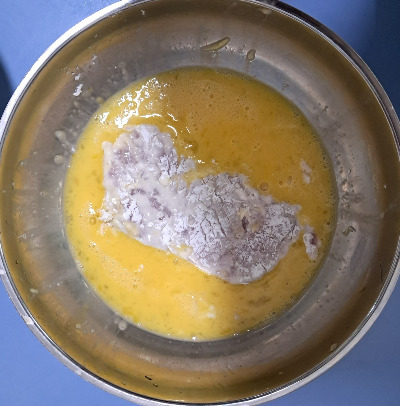 4. 감자전분을 묻힌 등심을 계란물에 푹신 적셔 빵가루 옷을 입힌다.