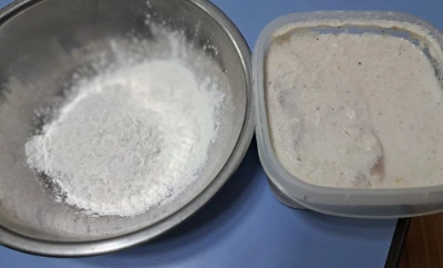 ** 오른쪽은 우유에 잰 등심이고 왼쪽은 감자전분가루이다. **