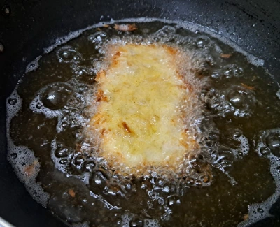 기름 솥에서 빵가루 옷 모양이 형성되었을 때 꺼내 1분 쯤 있으면