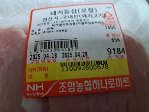 돼지고기 등심 656g을 9,184원에 샀다.