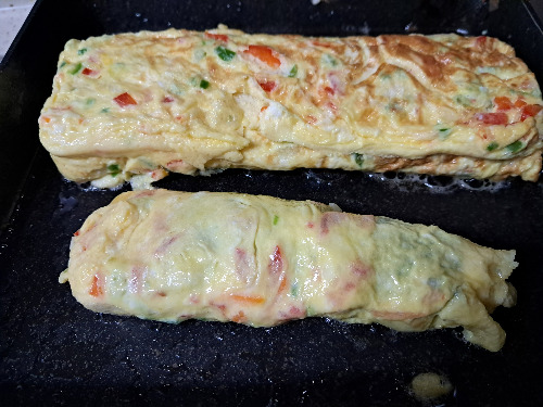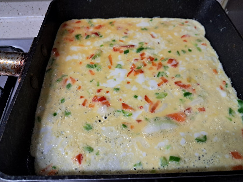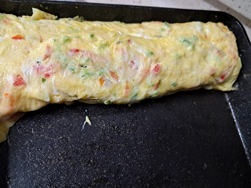 2. 팬을 달군 후 중간 약불에 계란물을 부어주어 살짝 익힌 후 말아준다.
