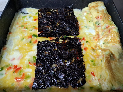 3. 말아준 계란을 한쪽에 밀어 넣고 계란물을 붓고 김 2조각을 넣고