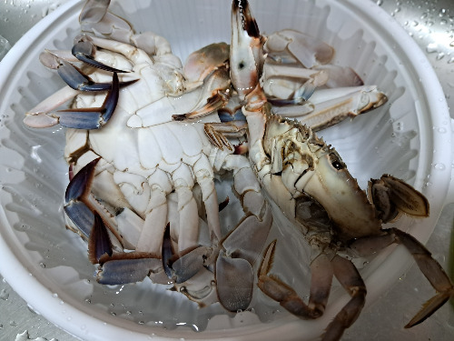 해물을 팔고 있다. 새우와 멸치에 소금을 넣고 젓을 담아 팔고 있다. 그곳에서 가져온 꽃게다.